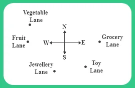 Toy lane was towards the south-west of grocery lane such that it was situated towards the east of Jewellery lane.