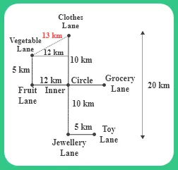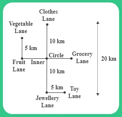 As Inner circle is the mid point between clothes lane and Jewellery lane, thus its distance with clothes lane must be 10 km, thus the distance between fruit lane and vegetable lane must be 5km