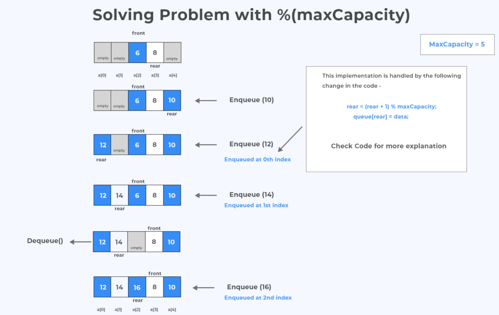 #include #define maxCapacity 5 int queue[maxCapacity], front = -1, rear = -1, currSize = 0; void enQueue(int data){ if(currSize == maxCapacity) printf("\nMax Size reached can't do enqueue"); else{ if(front == -1){ front = currSize = 0; rear = maxCapacity - 1; } //imagine scenario where enqueue is happening at last element of queue //if some dequeue has happened then 0th element or others may be free //using % operation we can now enter at 0th or others positions here rear = (rear + 1)%maxCapacity; queue[rear] = data; currSize = currSize + 1; printf("%d Successfully Enqueued at array pos:%d\n", data,rear); } } void deQueue(){ if(currSize == 0) printf("\nNo elements, queue is empty can't dequeue"); else{ printf("\nDequeued : %d", queue[front]); int item = queue[front]; front = (front + 1)%maxCapacity; currSize = currSize - 1; printf("\n%d Successfully dequeued & changed front value which is: at pos:%d\n", item,front); } } void display(){ if(rear == -1) printf("\nQueue was Empty!!!"); else{ int i; printf("\nQueue :\n"); for(i=front; i<=rear; i++) printf("%d ",queue[i]); } } int main() { enQueue(2);//front: a[0], rear: a[0] enQueue(4);//front: a[0], rear: a[1] enQueue(6);//front: a[0], rear: a[2] enQueue(8);//front: a[0], rear: a[3] //front: a[0], rear: a[3] deQueue();//0th pos now empty, //front: a[1], rear: a[3] deQueue();//1st pos now empty, //front: a[2], rear: a[3] //note the explanation in the above image starts from here enQueue(10);//front: a[2], rear: a[4] //front: a[2], rear: a[4] //rear = (rear + 1)%maxCapacity; a[rear] = data; //rear = (4 + 1)%maxCapacity; i.e. rear = 5%5 = 0, thus, a[0] = 12; enQueue(12);//front: a[2], rear: a[0] enQueue(14);//front: a[2], rear: a[1] deQueue();//2nd pos now empty, front: a[3], rear: a[1] enQueue(14);//front: a[3], rear: a[2] return 0; }