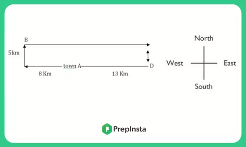 Town D is 13 Km. towards the East of town A. A bus starts from town A travels 8 Km. towards West and takes a right turn. After taking the right turn, it travels 5 Km. and reaches town B. From town B the bus takes a right turn again, travels 21 Km. and stops. How far and towards which direction must the bus travel to reach town D?
