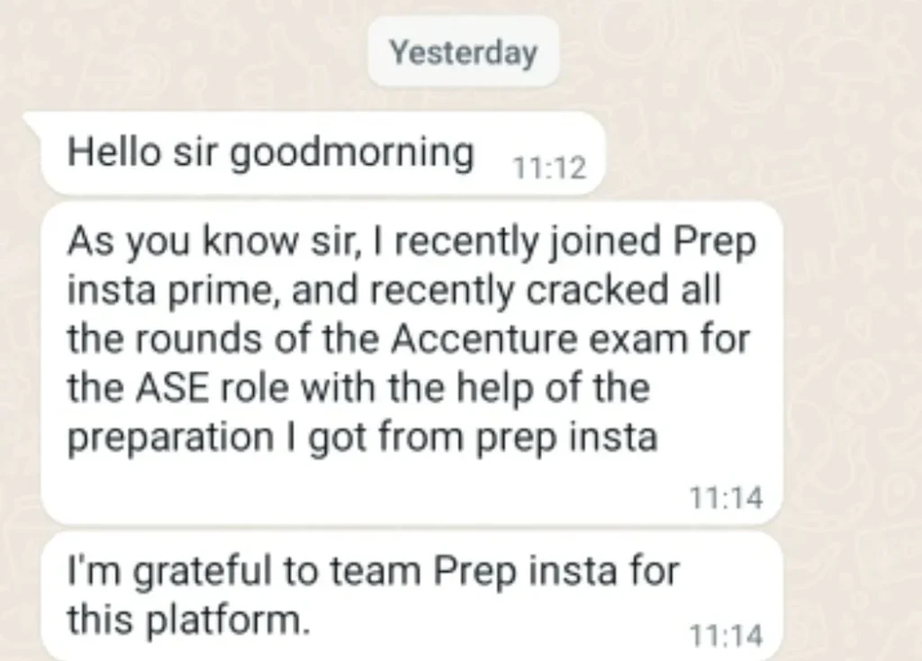 Everyone defines “success” differently. Some people define success as having a lot of money, earning respect or being “the boss” or in a leadership position. In order to be successful in your field or at your job, you first need to define what success means to you. That is where PrepInsta comes into my life when all hope was gone. They guided me about how should I approach in appearing for Off-Campus Drives and other exams and from which specific materials i should prepare from. After a long, 1 Hour-Discussion, finally I got learned that preparing hard is not enough but to prepare smart is what required by most of the companies. Finally, after 4 months of Smart Preparation, I got placed in Accenture at Bangalore branch. Hope to meet you guys there soon..!!"