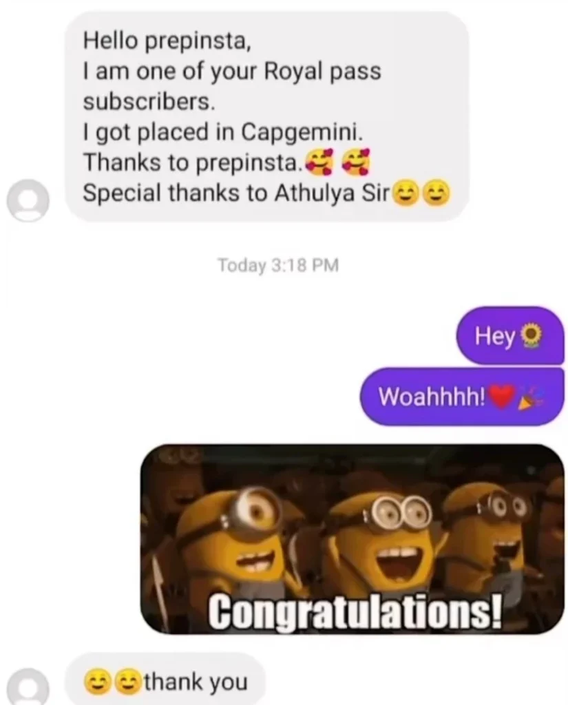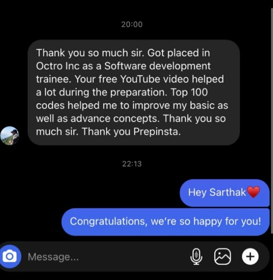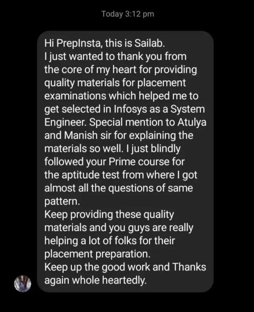 Got selected in 2 of the MNCs because of PrepInsta. Thank you PrepInsta for your guidance and for clearing my every doubt. Your teaching methods are very unique.