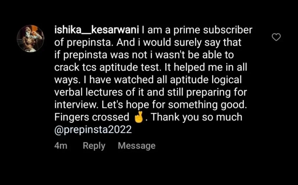 I want to thank PrepInsta for improving my basics by providing conceptual knowledge in simple tricks. I cleared my TCS examination with the help of PrepInsta Online Classes. I was so worried when I started my preparation, but with the guidance of PrepInsta Mentors, I started improving my skills and now I am a confident man. Also, I gave my detailed experience here: medium.com