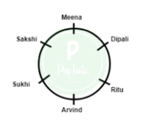 6 friends Sukhi, Arvind, Sakshi, Meena, and Dipali are sitting in a circle facing the center.
